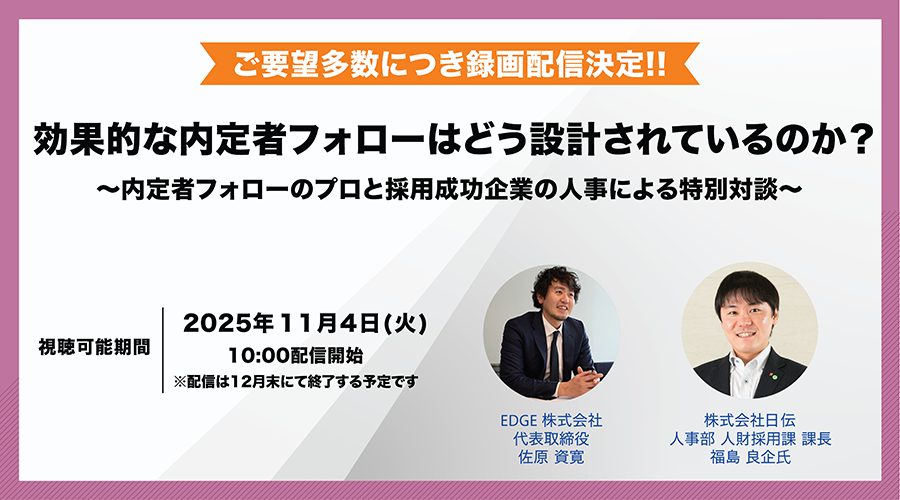 そこで、内定者フォロー専用サービス「エアリーフレッシャーズクラウド」を提供し、内定者フォローを知り尽くしたEDGE代表の佐原と、長年エアリーフレッシャーズクラウドを活用して採用を成功させ、採用人気企業No.1に輝いた実績のある株式会社日伝の採用責任者、福島氏との対談形式のウェビナーを実施することといたしました。